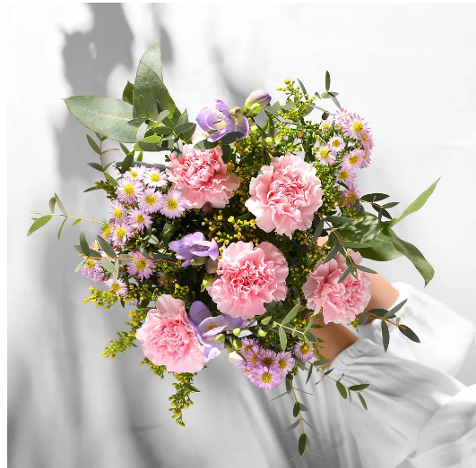 - Dieser Strauß sorgt mit seinen fröhlichen Blüten wie Nelken, Freesien und Astern in lieblichen Farbtönen direkt für heitere.