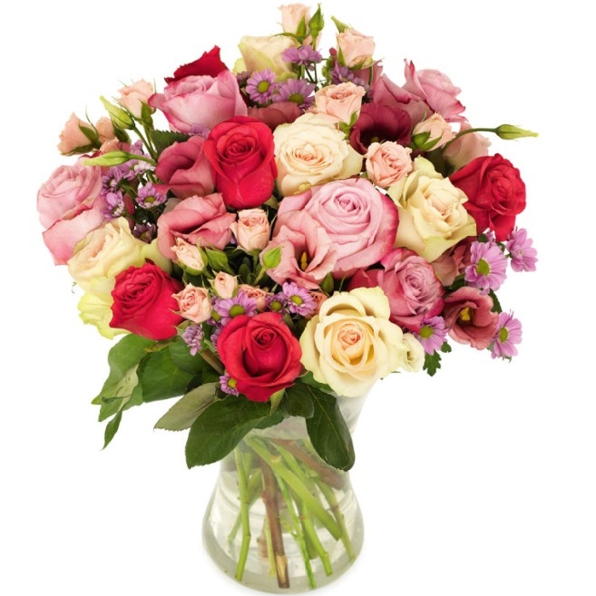 Allein schon der Anblick dieses pastellfarbenen Straußes ist pure Freude und Entspannung. Ein harmonischer Mix aus Rosen, Sprayrosen, Santini und Eustoma kommt als frische Überraschung per Florist an die Haustür.