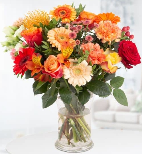 Beim Anblick vom bunten Blumentraum wird einem gleich ganz warm ums Herz. Die Blüten von Gerbera, Nelken, Chrysantheme, Lisianthus, Inkalilien und Rosen leuchten in den schönsten Farben um die Wette und werden nur vom sogenannten Nadelkissen (der Proteaceae) getoppt. Rote Beeren runden das Gesamtbild des herbstlichen Blumenstraußes ab.